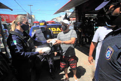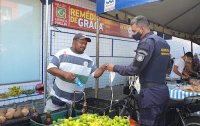 A Secretaria Municipal de Segurança Pública e Defesa Social (Semdes) realizou neste sábado (1º) mais uma grande ação de prevenção ao Covid-19, dessa vez na área do comércio popular e feira livre dos bairros do Alecrim e Cidade Alta, além da região da Praça Gentil Ferreira e praias urbanas. Guardas municipais lotados no Grupamento de Ação Patrimonial (Gapa) e na Ronda Saúde (RondaS) distribuíram cerca de 3.500 máscaras de proteção com pessoas que estavam sem o equipamento de proteção individual.
